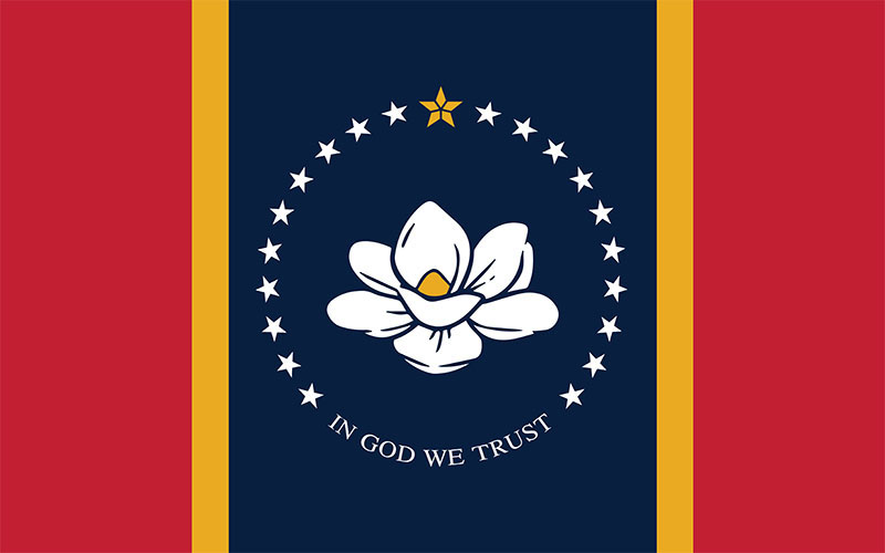 Submitted to the legislature by Starkville-based graphic designer Rocky Vaughan (b. ca. 1977) and collaborators Sue Anna Joe, Kara Giles, and Dominique Pugh, the new flag took effect in January 2021 after voters approved it and the governor ratified it. The current flag features a central vertical band of blue, flanked by two thin gold bands and encompassed by two broader red ones. The flag’s center is dominated by a single magnolia flower, crowned by a single gold star and encircled by 20 white ones. Beneath the flower are emblazoned the words “In God We Trust.”