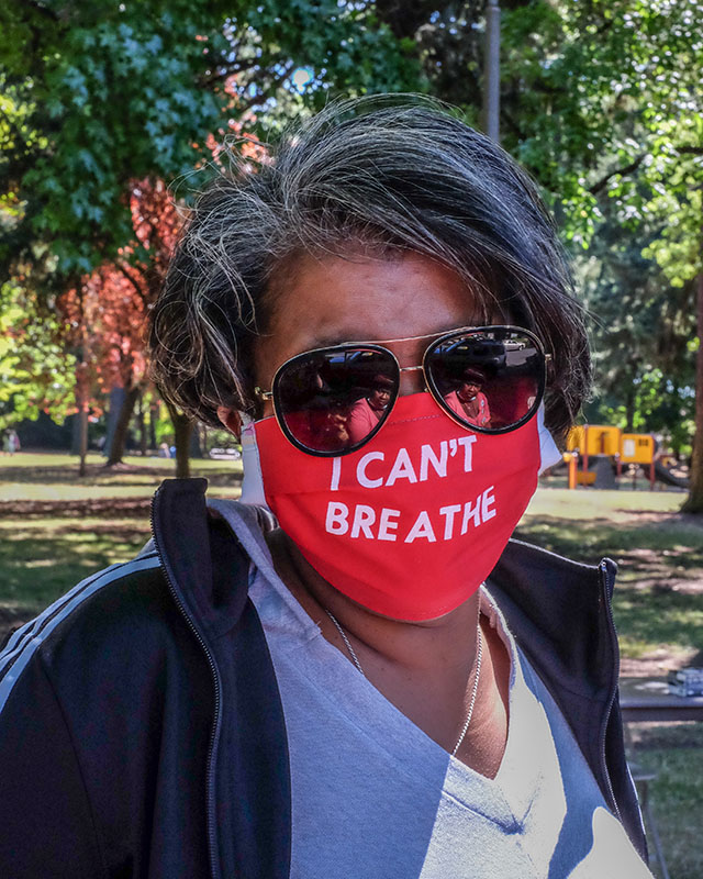 Placing the slogan on a mask is a design choice likely to provoke those who have argued against mandated mask wearing as an assault on personal liberty and who have proclaimed they could not breathe while wearing masks. Juxtaposition, or placing contrasting elements close together, is a technique that image creators often use for a variety of purposes: humor, irony, sarcasm, or—as in this case—disgust or outrage. The juxtaposition of the mask with a slogan referencing literal asphyxiation emphasizes the wearer’s view that state violence against People of Color is a more serious threat to their existence than a mask. Thus, the image is open to multiple interpretations.