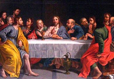 Trois évangélistes – Matthieu, Marc et Luc – rapportent le récit de la Cène, la veille de son arrestation : alors que Jésus et ses disciples se trouvent au Cénacle, Jésus prend du pain et du vin, et après les avoir bénis il les offre en proclamant : “Prenez, mangez, ceci est mon corps. […] Buvez-en tous ; car ceci est mon sang, le sang de l’alliance, qui est répandu pour plusieurs, pour la rémission des péchés.” (Matthieu 26, 26-30)