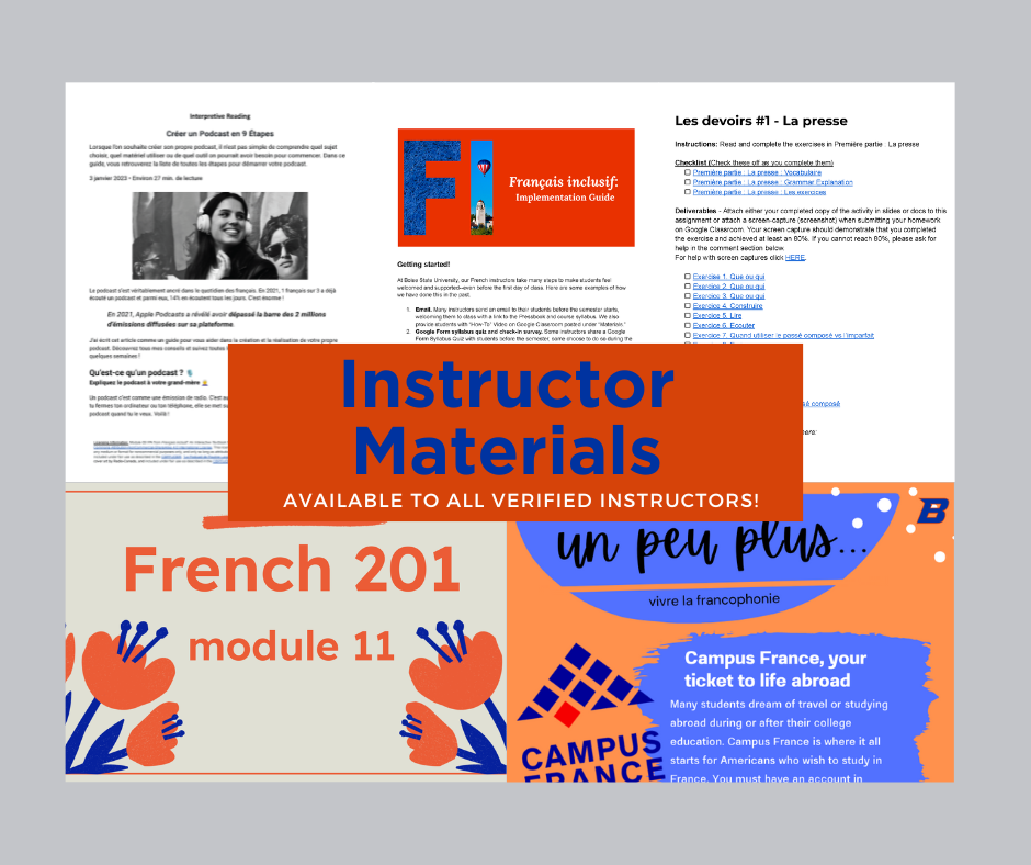 Collage of different instructional materials with text that says "instructor materials" available to all verified instructors.