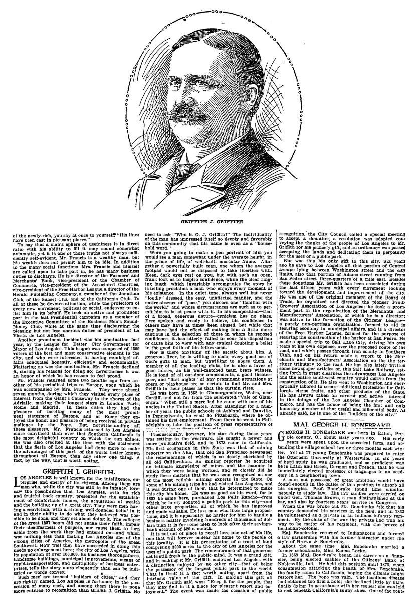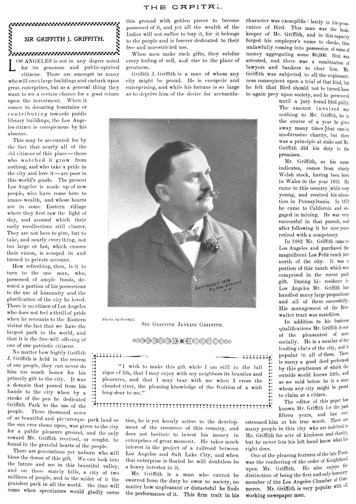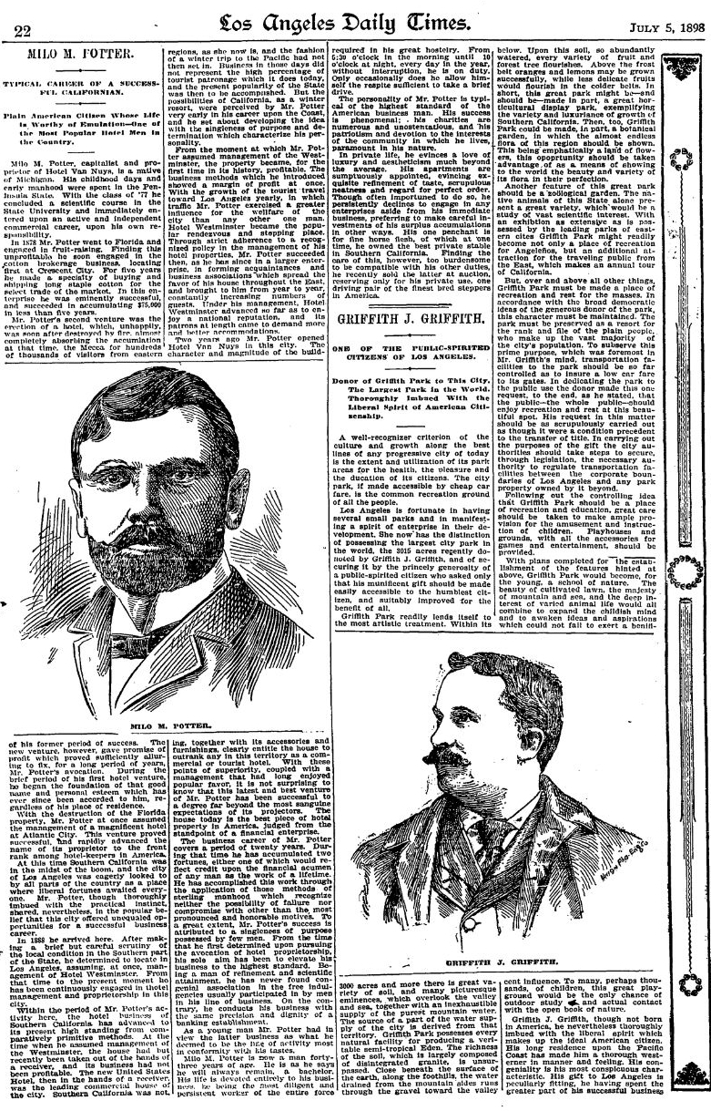 Six months later, on July 5, he was back for the Times’ “Patriotic War” edition, where a new profile and pen portrait focused on “the princely generosity of a public-spirited citizen who asked only that his munificent gift should be made easily accessible to the humblest citizen, and suitably improved for the benefit of all.” The Times was celebrating U.S. military might in the midst of the war against Spain in Cuba, and used the various profiles to showcase patriotic Americans, honoring the Wales-born Grif as one of its own. “Griffith, though not born in America,” it stated, “he nevertheless is thoroughly imbued with the liberal spirit which makes up the ideal American citizen.”