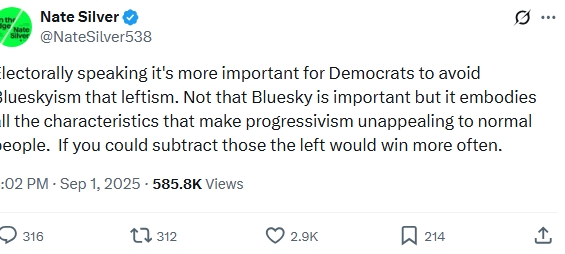 Ie Nate Silver’s political ideology is the emotional logic of institutional complacency, where “data journalism” becomes a kind of epistemological laundering—stripping politics of urgency, flattening moral stakes into statistical noise, and rationalizing elite detachment as objectivity.