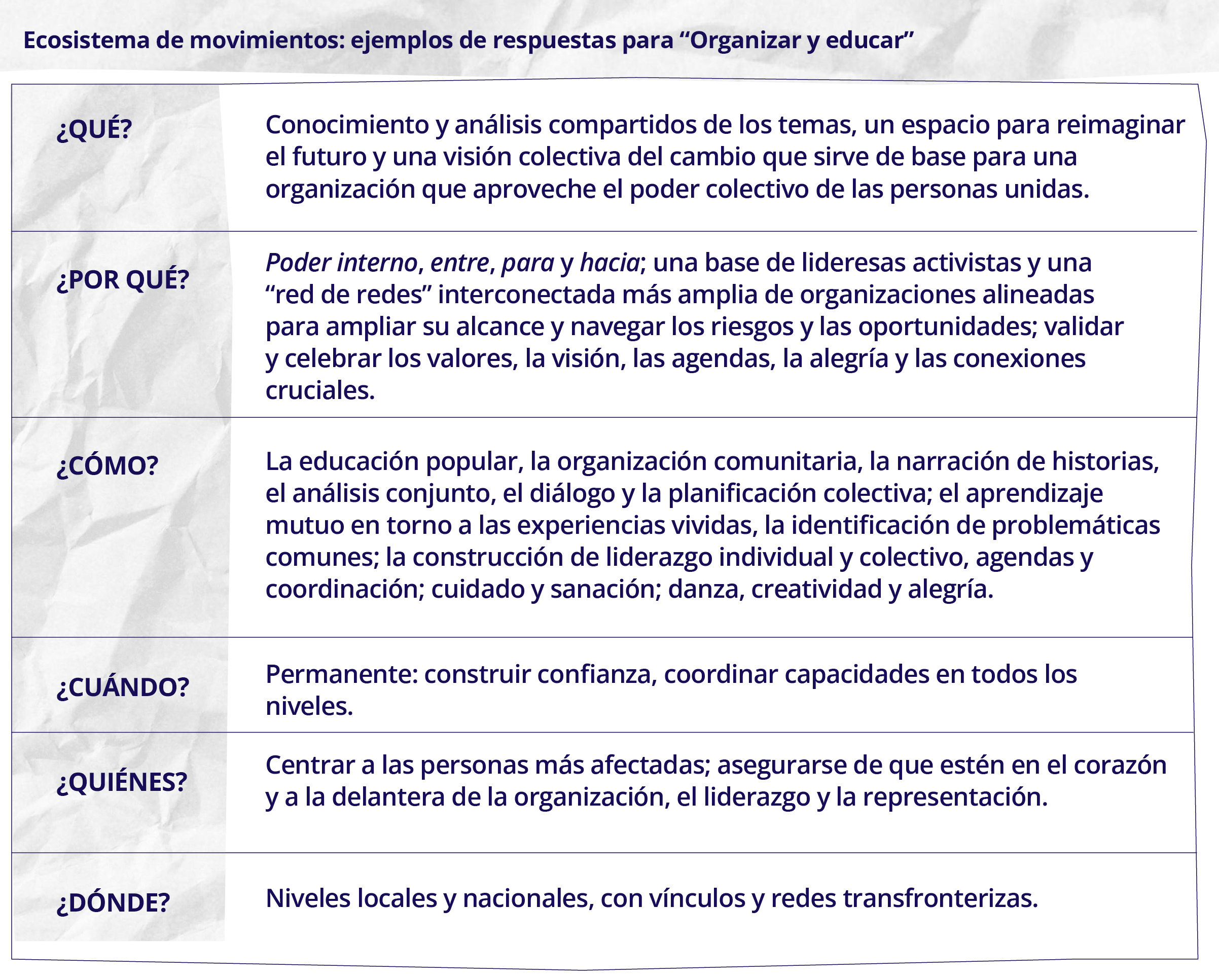 No todas las personas que utilizan esta Guía desempeñarán una función en la construcción directa y el fortalecimiento de movimientos, pero todas podemos ubicar nuestras acciones dentro del ecosistema más amplio de movimientos en el que se sitúan nuestras organizaciones y agendas, e identificar formas de conectar, alinear, coordinar y construir poder, conexiones y una “infraestructura” de movimientos.