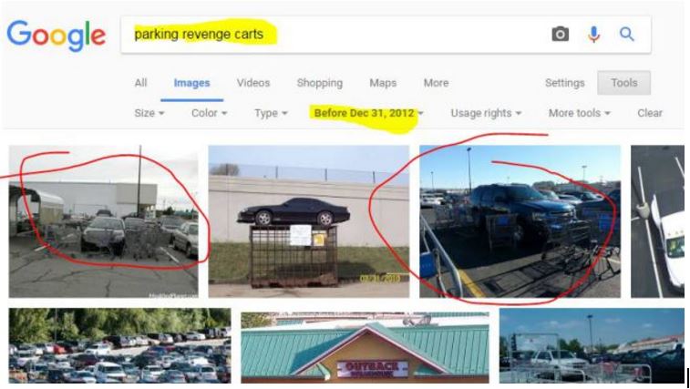 Just because we’re extra suspicious, we throw the image into Google Image to see if maybe this is a recycled image. Sometimes people take old images and pretend they are theirs — changing only the the supposed date and location. A Google Reverse image search (see below) shows that It does not appear to be the case here, although in doing that we find out this is a very common type of viral photo called a “parking revenge” photo. The specific technique of circling carts around a double-parked car dates back to at least 2012: