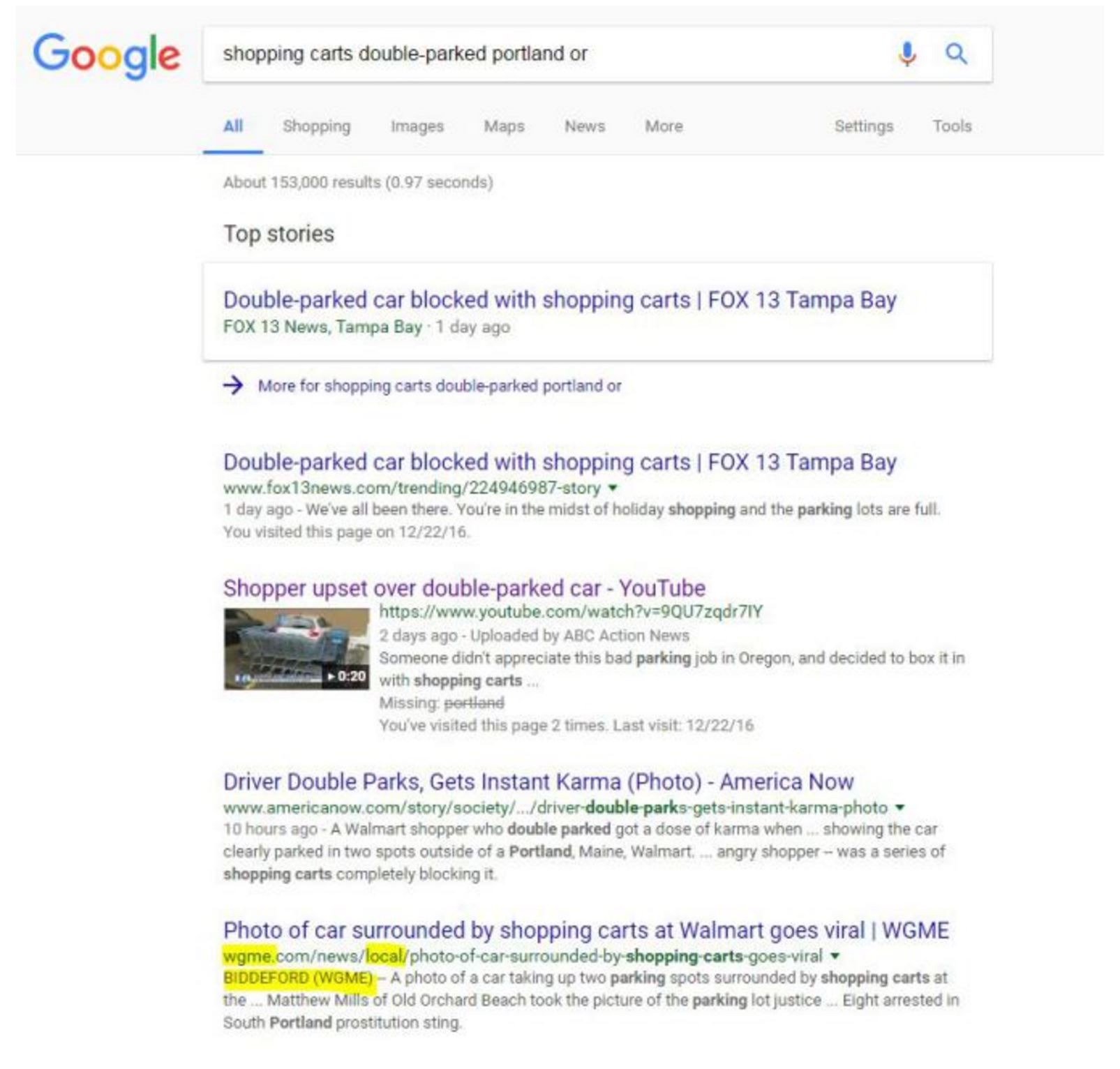 This brings me to a YouTube video that tells me this was taken “outside a Portland, Oregon Walmart” and has been shared “hundreds of times since yesterday”. So back to search. This next result shows you why you always want to look past the first result:
