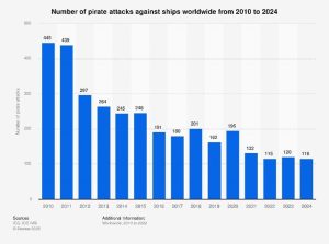 According to Statista Research Department, “In 2024, the number of pirate attacks against ships worldwide decreased compared with the previous year. While 120 ships were attacked by pirates in 2023, the number of ships attacked dropped to 116 in 2024.” (Number of pirate attacks against ships worldwide from 2010 to 2024, 2025).