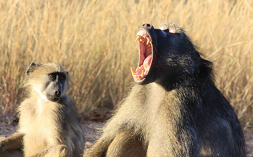 The cercopithecine monkeys live mostly in tropical Africa. They tend to have larger bodies than colobines. Some cercopithecine monkeys have moved into savanna environments and are largely terrestrial, living mostly on the ground. Terrestrial monkeys like baboons have ischial callosities informally known as “butt patches”, which are an adaptation to sitting on the ground. Terrestrial monkeys also tend to be sexually dimorphic. Male baboons, for example, are larger than females and have longer canines. Macaques, baboons, mangabeys, and guenons are examples of cercopithecines.