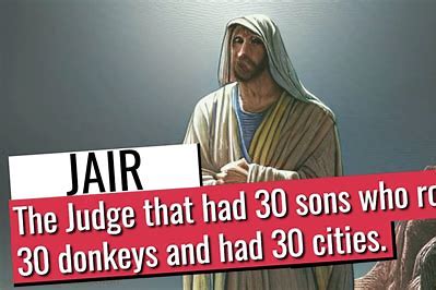 Jaïr succède à Thola, il est juge d’Israël pendant 22 ans et appartient à la famille des Galaadites dont l’ancêtre est Galaad3. Originaire de la région de Galaad, il a 30 fils qui montent chacun un ânon et qui possèdent chacun une ville4. Ces villes sont appelées Havvoth-Jaïr, ce qui signifie « douars » ou villages de tentes dans l’Ancien Testament. Il est enterré à Qamôn5.