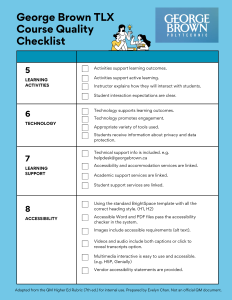 Busy instructors often benefit most from tools they can use immediately. Quick-start guides and checklists break down complex processes into small, achievable steps. The George Brown TLX Course Quality Checklist follows this approach by giving faculty a clear starting point, reducing cognitive load, and helping them focus on essential decisions. Rather than guessing what to include or how to structure a course, instructors can follow the checklist one step at a time.