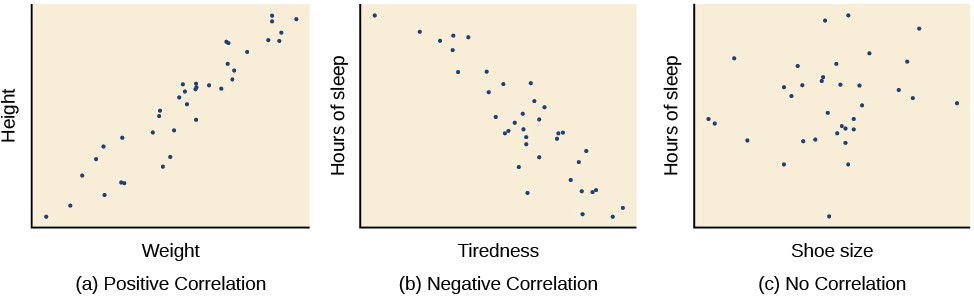 Figure 2.12 Scatterplots are a graphical view of the strength and direction of correlations. The stronger the correlation, the closer the data points are to a straight line. In these examples, we see that there is (a) a positive correlation between weight and height, (b) a negative correlation between tiredness and hours of sleep, and (c) no correlation between shoe size and hours of sleep.