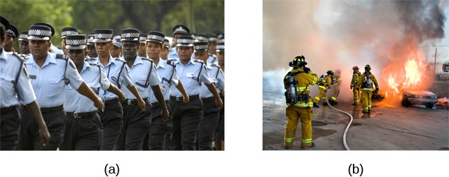 Figure 6.14 (a) Police officers and (b) firefighters hold high stress occupations. (credit a: modification of work by Australian Civil-Military Centre; credit b: modification of work by Andrew Magill)