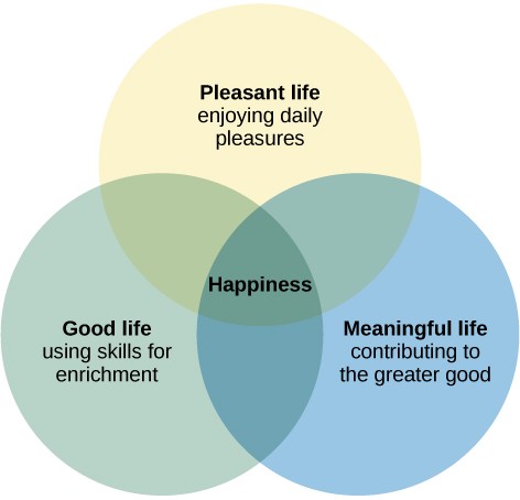A Venn diagram features three circles: one labeled “Good life: using skills for enrichment,” one labeled “Pleasant life: enjoying daily pleasures,” and another labeled: Meaningful life: contributing to the greater good.” All three circles overlap at a section labeled “Happiness.”