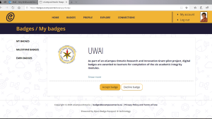 The CanCred open badges infrastructure has multiple technical advantages over other badging systems. First, CanCred Factory and Passport enables and easily manages badges and sharing in an interoperable digital environment, avoiding the complexity of handling different management systems. Second, the infrastructure facilitates trusted brand recognition. The authenticity of the issuer organizations and achievement can be verified and authenticated via embedded web links and metadata. Third, the system supports evidence-based research, thus allowing user tracking and data analysis. Detailed reports can be generated, providing information for how badges have been received, used, and ranked by different target groups. Fourth, CanCred supports different open sources plug-ins and could be interoperable for easy integration with multiple Learning Management System (LMS), such as Moodle, WordPress, Mahara, Optima. Fifth, CanCred is mobile friendly and is fully functional with most smartphones and tablets for badge management and sharing. Finally, it easily engages and motivates badge earners, providing free personal learning cloud service where badge earners can display and share their badges and use them to build their ePortfolios. CanCred facilitates community building; allowing online social interaction between badge earners, organizations and communities of practice. Setting up a free a CanCred Passport account associated with the learner’s academic institution email address makes it possible to publish selected badges on learner’s profile pages via CanCred. Learners choose whether or not to claim badges earned. Additionally, learners may choose to make their badges viewable publicly.