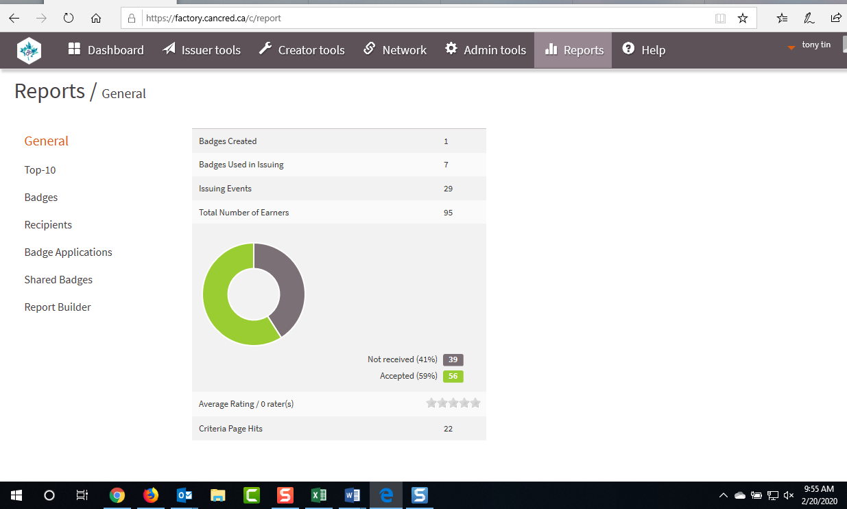 CanCred Passport is the default destination for open badges issued from its companion platform, CanCred Factory. The platform was developed by Discendum, a leading educational technology company in Finland. An extensive reporting system monitors how badges are being used and shared (See Figure 1). Some useful features that support the use of digital badges for project use include: badge applications, multilingual badges, evidence uploads to Open Badge Factory (OBF) server, user role management (administrator, creator, issuer), simple badge creation and issuing interface, integration with LMS, endorsements and open API for third-party plugins. A free online service is available where learners earn digital badges and can easily receive, store and share them at the Passport site (See Figure 2). Criteria within each badge specifically identifies proof of achievements and skills that enable linkages to the issuer and relevant credentialing bodies (how and when the badge is earned) with verifying evidence (linking to a description and documents that demonstrate the completed work).