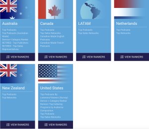 1) Among companies that do podcast rankings, Podtrac offers monthly rankings of downloads for Top 20 Podcasts and Top 20 Podcast Publishers. There are also monthly rankers for 30 different countries based on downloads.