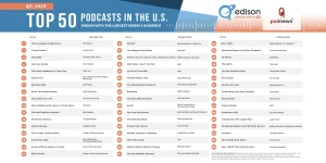2) Edison Podcast Metrics is the only quarterly podcast measurement service that measures the relative audience size and demographics of all podcast networks in the U.S. Data is collected from podcast consumers ages 13 and older in the U.S., asking participants to recall which podcasts they listened to in the past week.